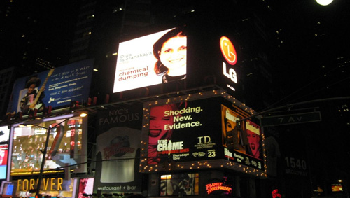 Доктор Ольга Сперанская, один из Чемпионов Земли, смотрит с большого экрана на Бродвей (Нью-Йорк). Рядом с ней — реклама компании LG Electronics, генерального спонсора мероприятия ЮНЕП
